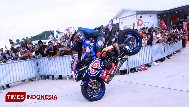 TIMES Solok/Pembalap PATA Yamaha Brixx Toprak Razgatlioglu melakukan atraksi stopie ban depan usai memenangi race 1 WSBK Mandalika 2022, Sabtu (12/11/2022). (FOTO: Tria Adha/TIMES Indonesia).