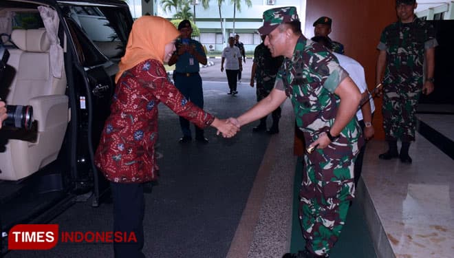 TIMES Solok/Pangdam V/Brawijaya, Mayjen TNI Wisnoe, P.B, menyambut kedatangan Gubernur Jatim, Khofifah Indar Parawansa di Makodam V/Brawijaya, Rabu (20/2/2019).(Foto: Istimewa)